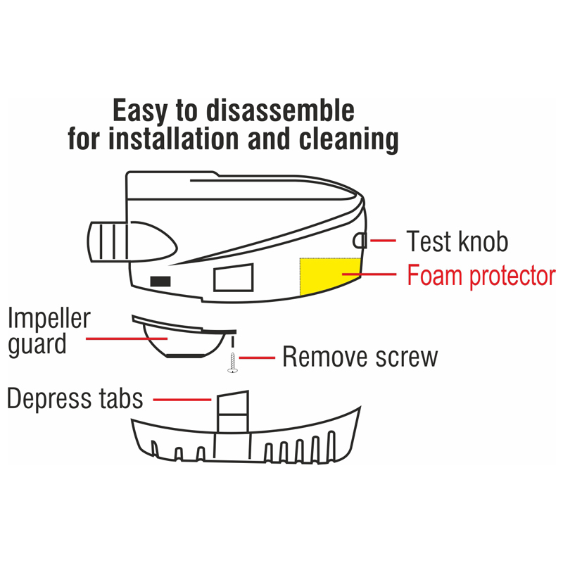 It features very simple disassembly for both installation and cleaning. It has a built-in automatic float switch which activates the pump when the bilge water rises, thereby allowing the pump to operate even when the boat is unattended. The pump also features a manual test button that allows you to test the level switch as well as the pump.
