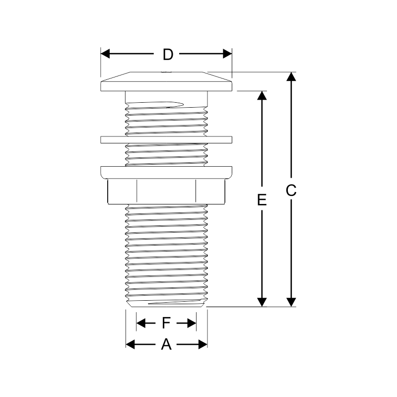 | Code | Description | Thread Ø A (inch) | Overall Length C (mm) | Flush Flange Ø D (mm) | Thread Length Ε (mm) | Int. Ø F (mm) | Optional Plug |